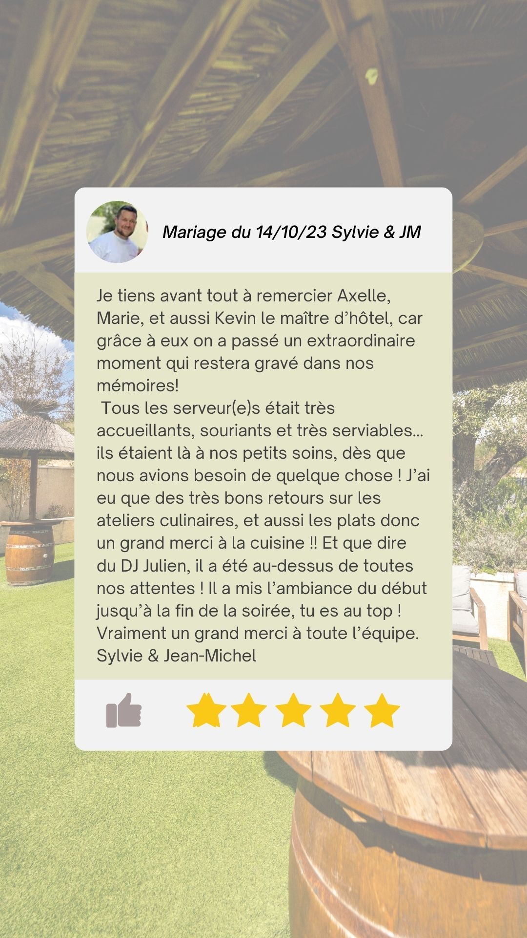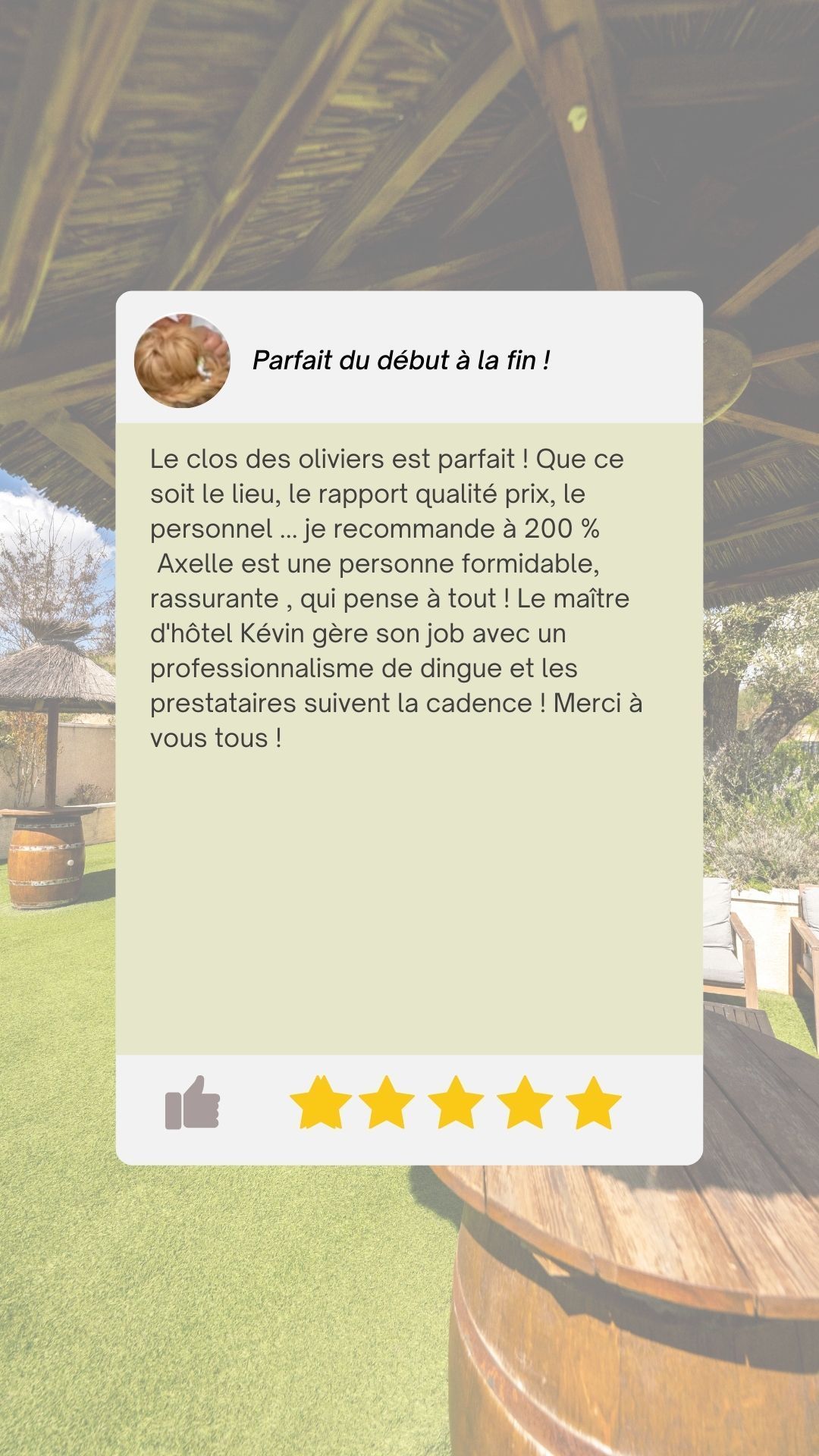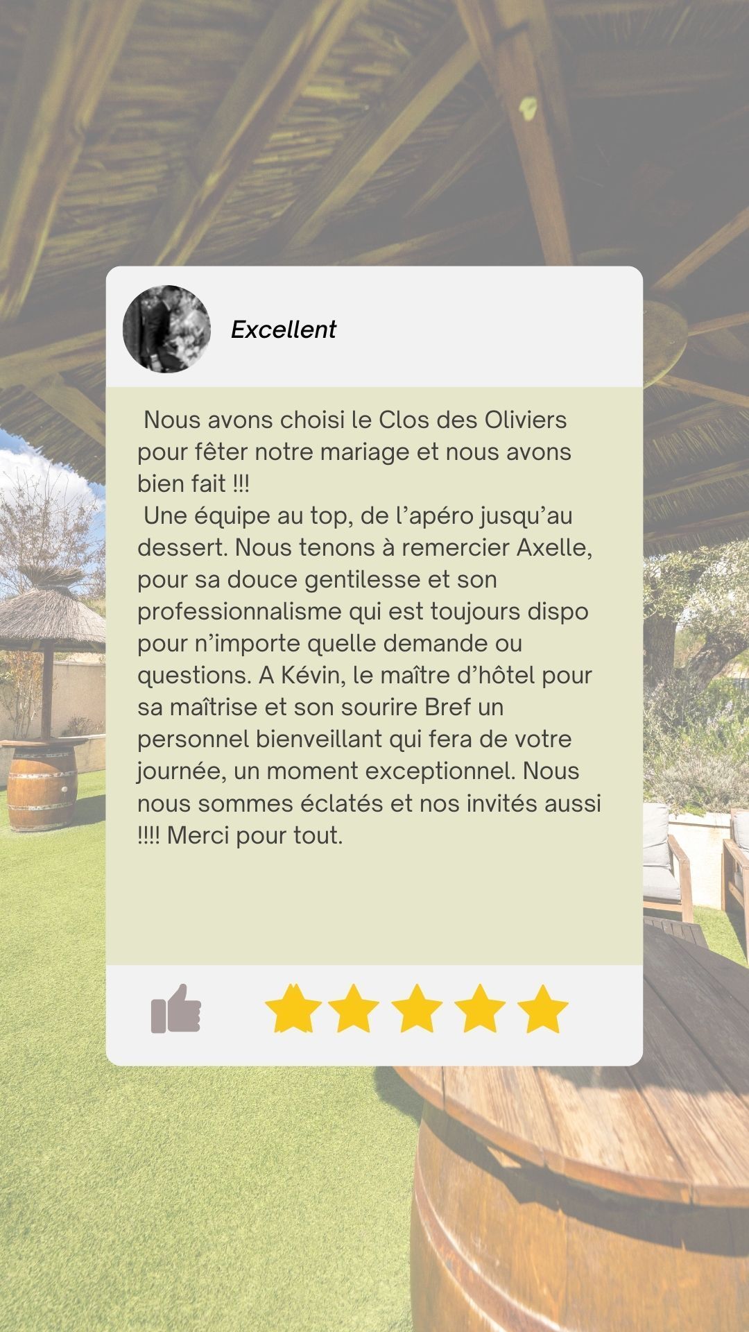 Le Clos des Oliviers dispone di una moderna sala ricevimenti che può ospitare fino a 150 persone. L'altezza del soffitto e lo spazio consentono un'illuminazione sublime per godersi la pista da ballo e trascorrere momenti festosi e caldi.